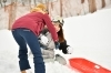 国見平の雪を持ち帰ろうとしている阿部。